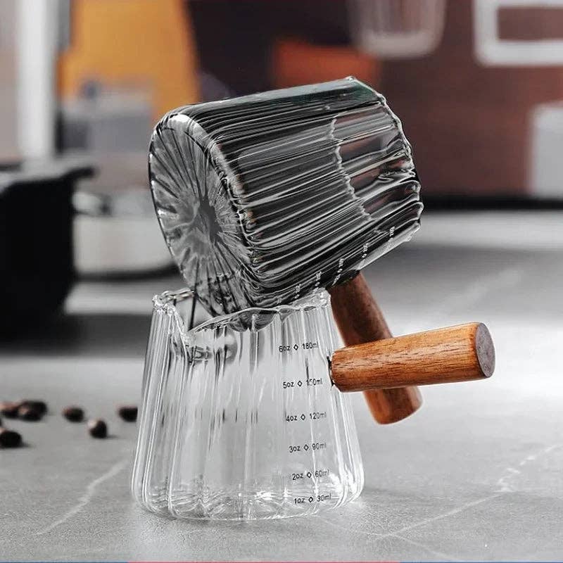 Crafted from high-quality borosilicate glass and a stylish wooden handle, it’s designed for durability and safe handling with hot liquids. Integrated measurement lines for precise brewing and easy recipe accuracy. Perfect for frothing milk, measuring espresso shots, or serving small beverages with a modern, refined look