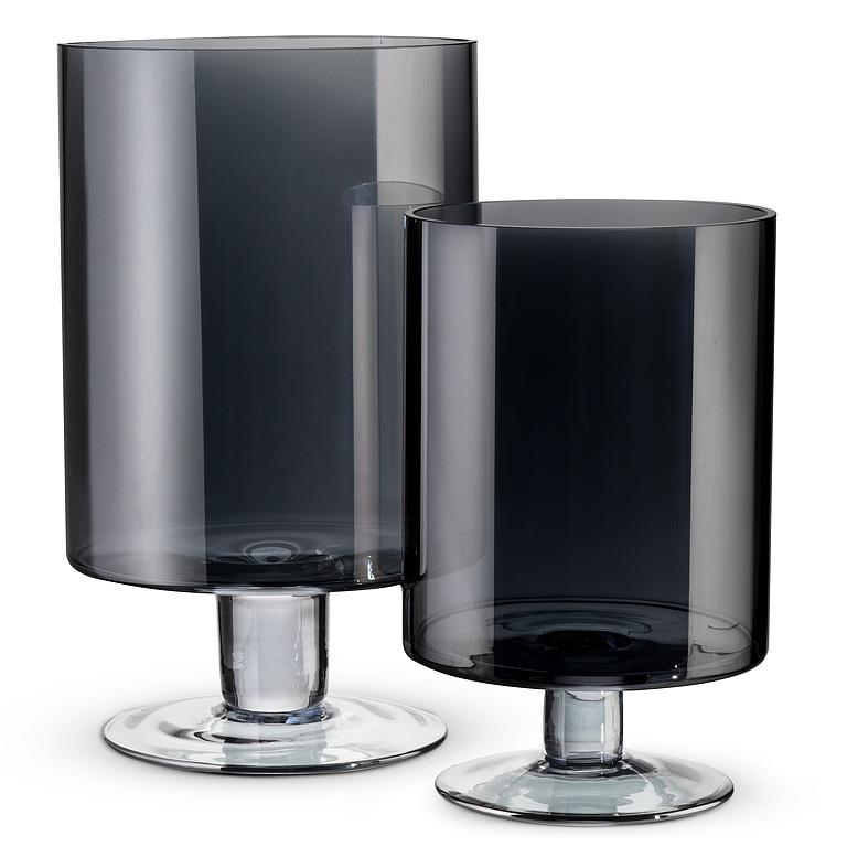 A smoke-colored glass hurricane with a soft iridescent finish that catches and reflects candlelight in shifting, atmospheric tones.